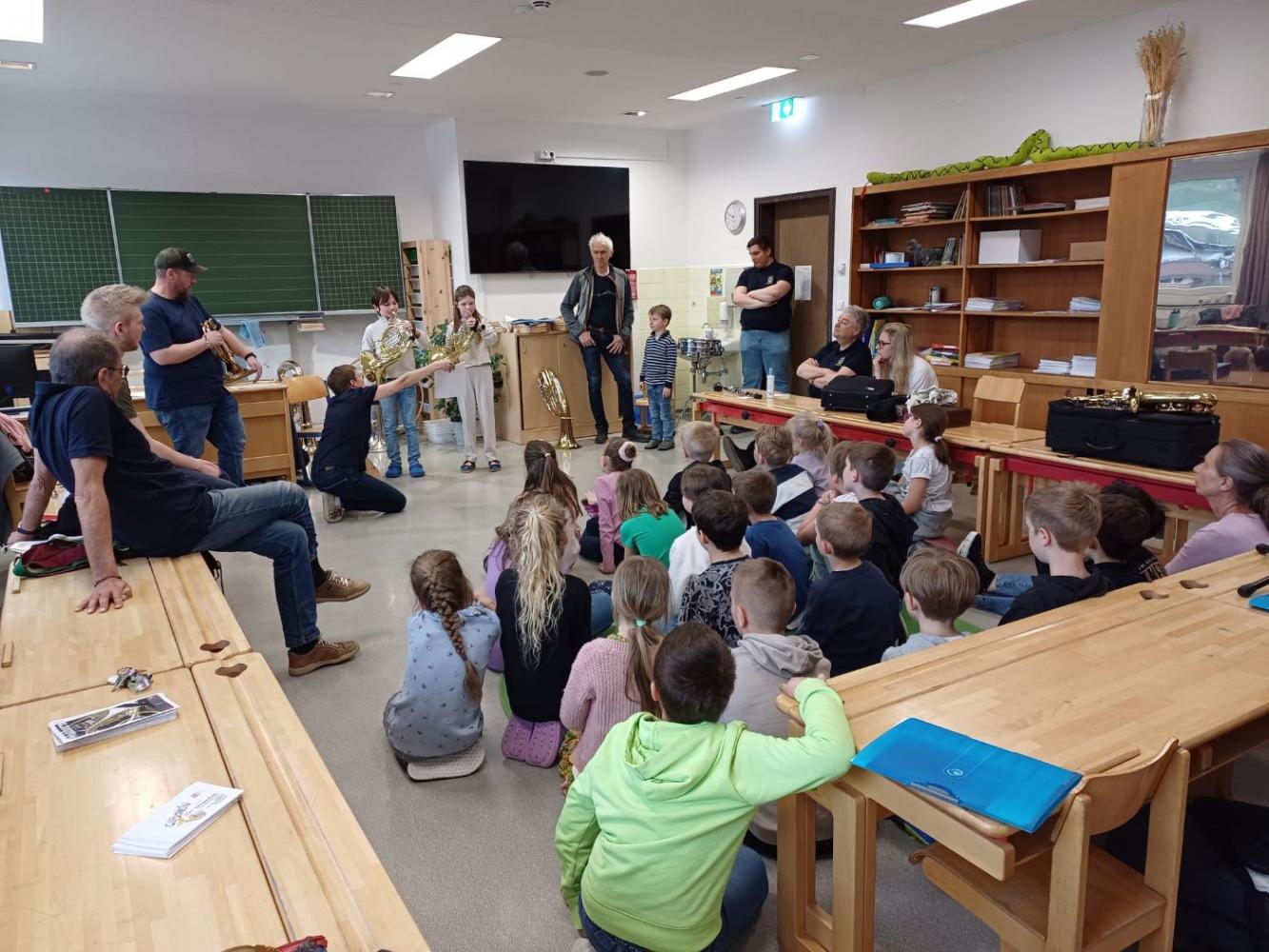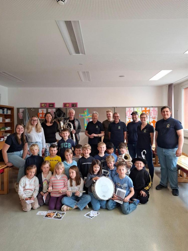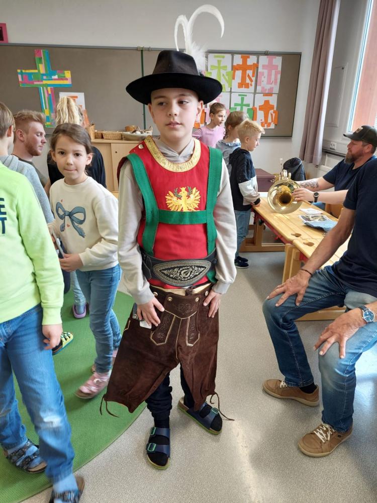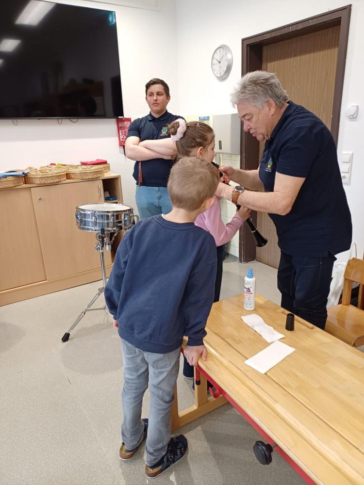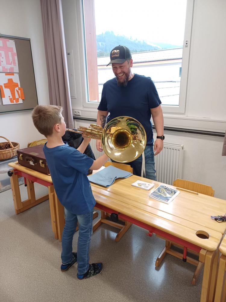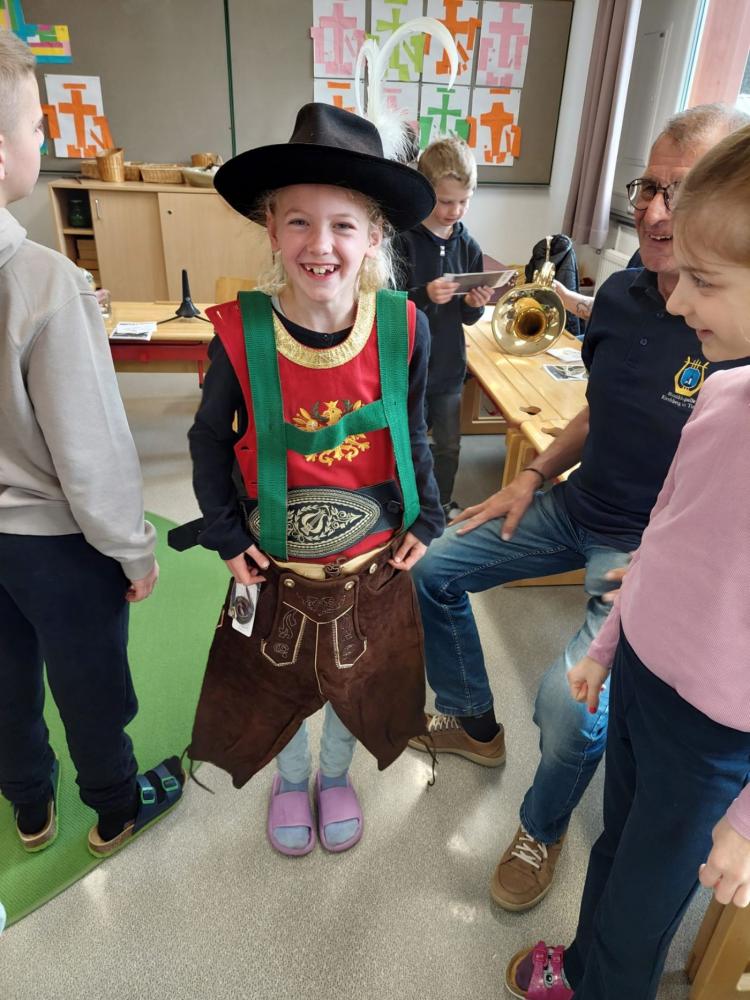 Die Musikkapelle Kirchberg hat unsere Schule besucht und viele spannende Instrumente mitgebracht. Die Musikerinnen und Musiker zeigten uns, wie die Instrumente klingen. Wir durften ganz nah zuhören und sehen, wie man die Instrumente hält und spielt. Unter fachkundiger Anleitung durften die Schülerinnen und Schüler selbst erste Klänge erzeugen und sich von den verschiedenen Tonfarben inspirieren lassen. Besonders aufregend war, dass wir sogar die Trachtanziehen durften und uns wie echte Musikantinnen und Musikanten fühlten. Die ganze Klasse hatte viel Spaß, und viele Kinder bekamen richtig Lust, später einmal selbst ein Instrument zu lernen.