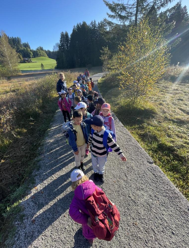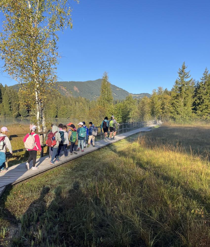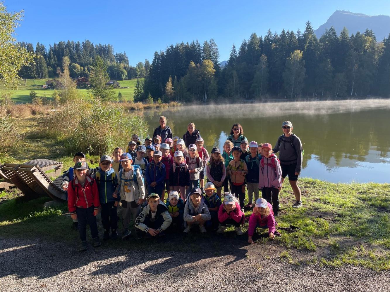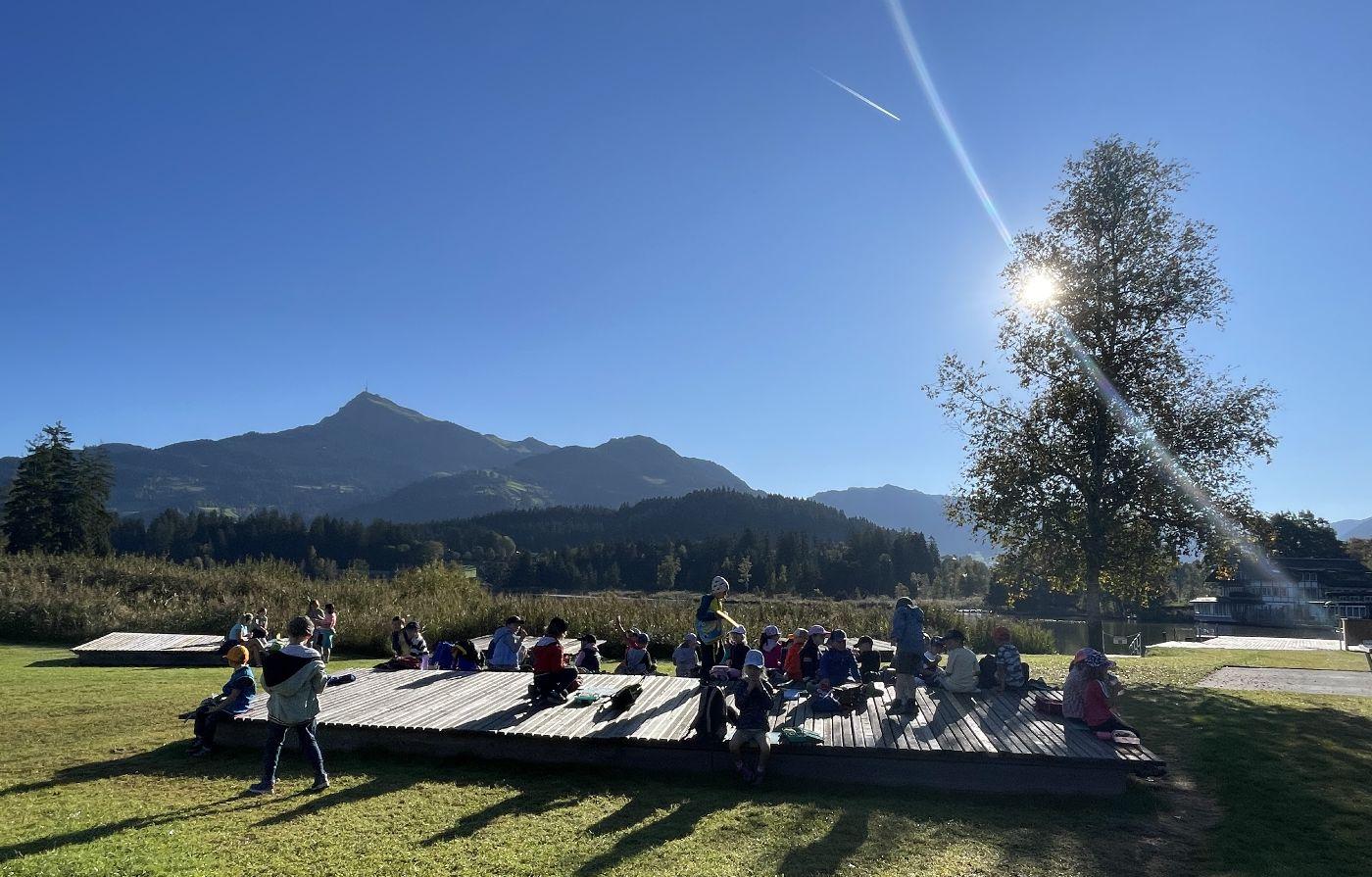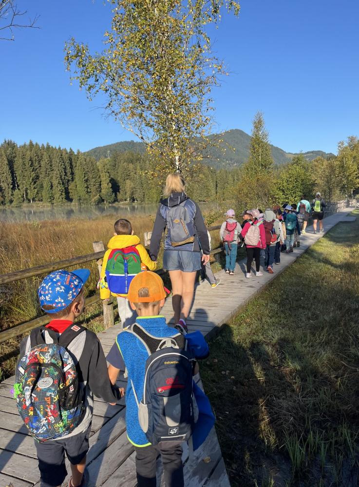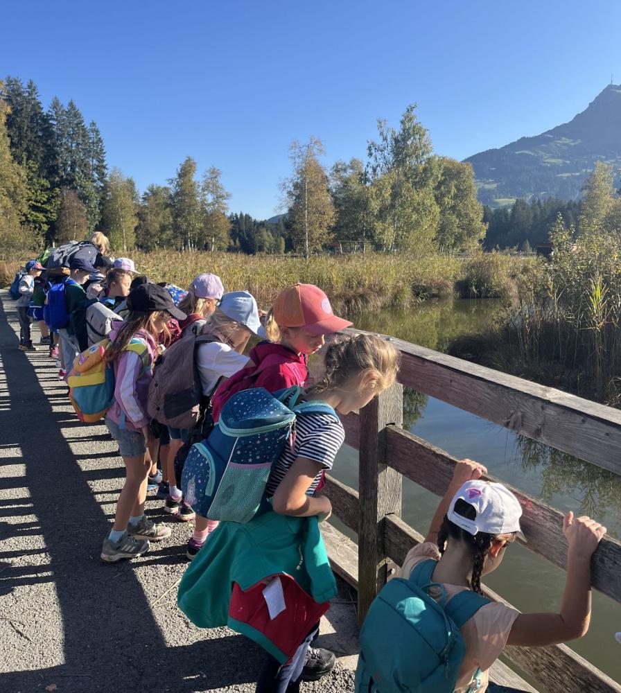 An unserem ersten Wandertag fuhren wir mit dem Bus nach Kitzbühel und umrundeten dort bei herrlichstem Wetter den Schwarzsee. Die Spinnennetze glänzten im Sonnenlicht vom Tau, der See glitzerte, die Sonne und wir strahlten um die Wette. Beim Stadtbad stärkten wir uns mit einer guten Jause bevor es zum Spielen auf den Spielplatz ging. Dann marschierten wir zurück zur Bushaltestelle. In Kirchberg angekommen, spazierten wir noch in die Waldschule, ehe es zurück in die Schule ging und das Wochenende startete.