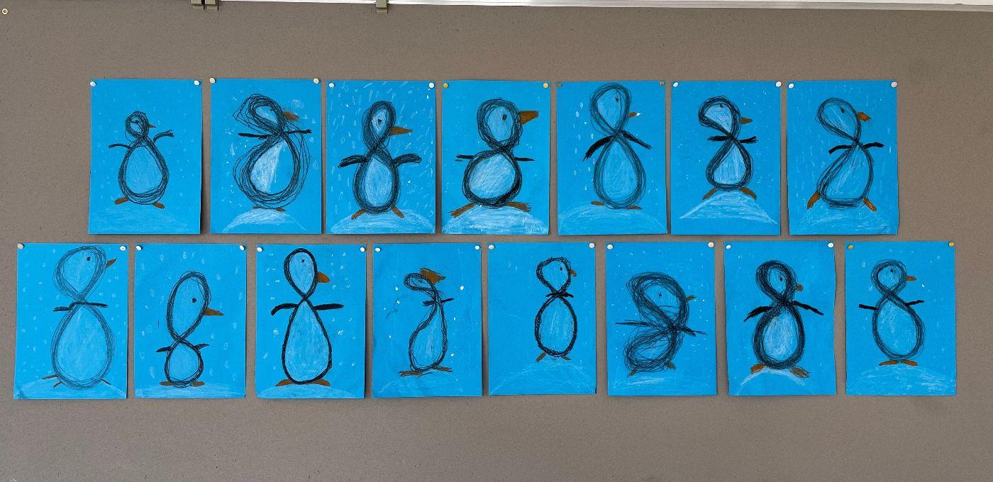 Nach den ersten erfolgreichen Webversuchen mit Papierstreifen vor Weihnachten wagten wir uns nun an eine neue Technik: das Weben mit Wolle. Jedes Kind gestaltete ein kleines, gewebtes Deckchen für ein zuvor ausgewähltes, schlafendes Tier. Diese Tiere wurden mithilfe einer KI von der Lehrperson generiert – ein moderner, motivierender Zugang, der von den Kindern begeistert aufgenommen wurde. Erstaunlich schnell und mit viel Geschick entstand außerdem eine ganze Pinguinkolonie, und zwar mithilfe der Zahl 8, die als Grundform diente. Aus nur wenigen Strichen wurden so im Nu viele sympathische Tiere. Auch unsere Bügelperlen erhielten ein kreatives Upgrade: Sie durften diesmal nicht einfach nur „herumliegen“, sondern wurden zufunktionierendenKreiseln weiterverarbeitet. Jedes Kind legte eine Form mit markiertem Mittelpunkt, die anschließend gebügelt wurde. Mit einem kleinen Stück Strohhalm als Griff und einer Holzkugel entstand daraus ein Kreisel, der sofort ausgiebig getestet wurde – mit viel Staunen und einem ordentlichen Tempo.