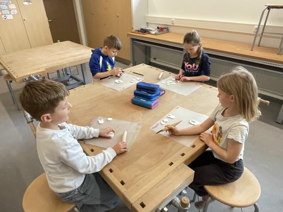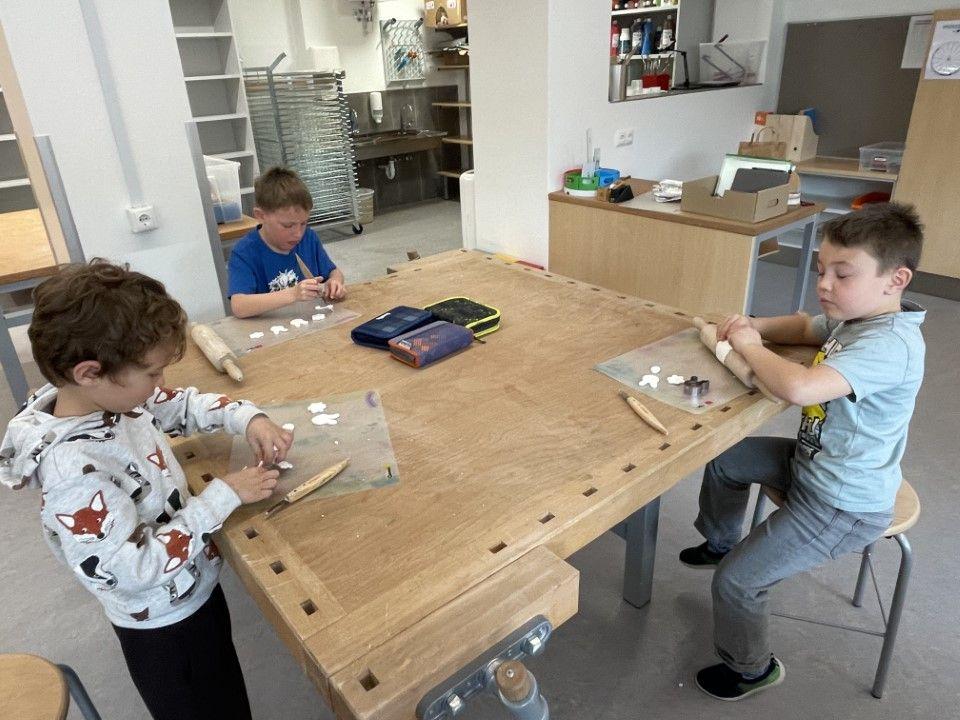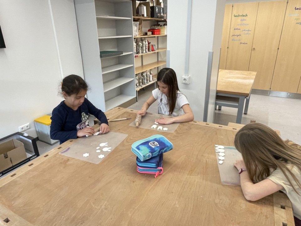 Die Kinder rollten die Modelliermasse aus, durften auch einen Musterroller zur Verzierung verwenden und stachen Ostermotive aus. Diese werden nächste Woche an die selbstgebauten und -gewebten Osterkörbchen als Deko angeklebt. Vielen Dank an Sabine für das Leihen der Ausstecher und Musterroller!