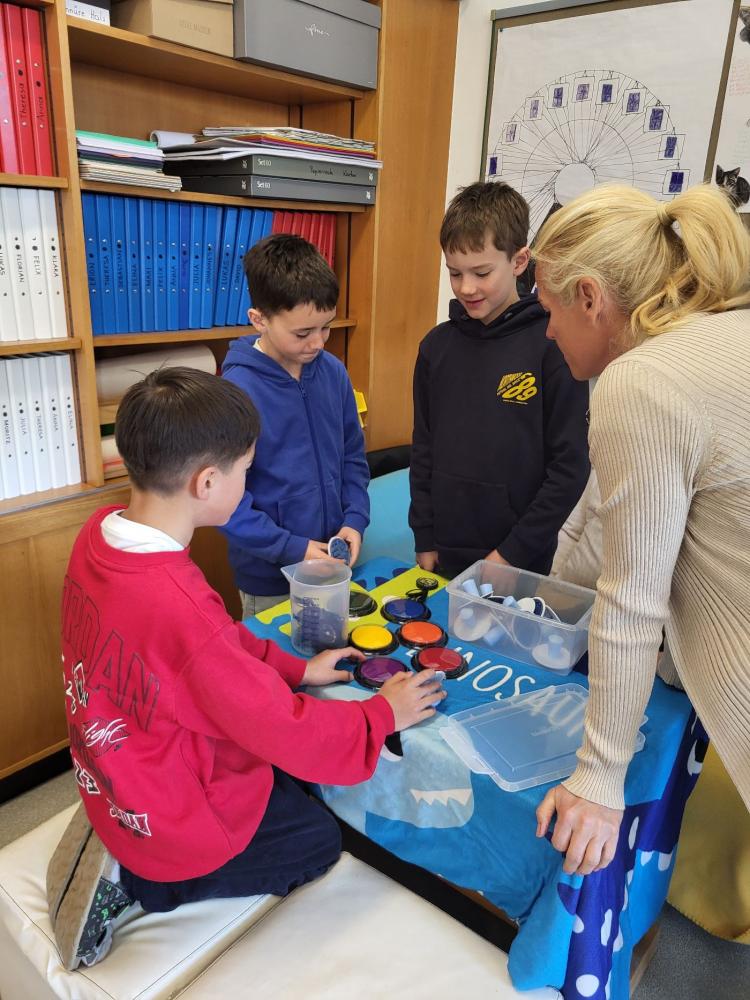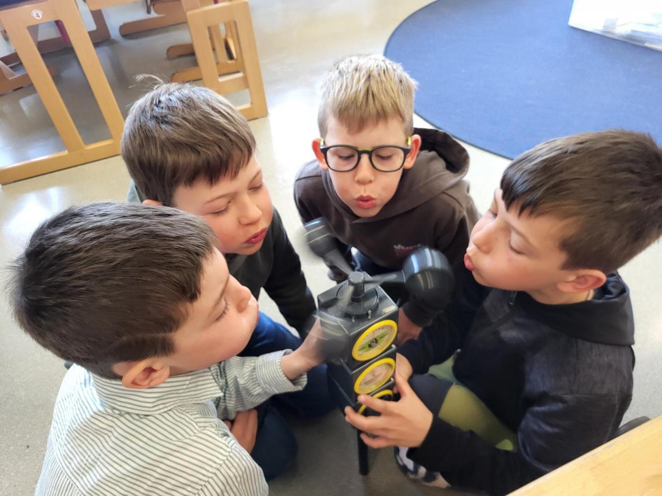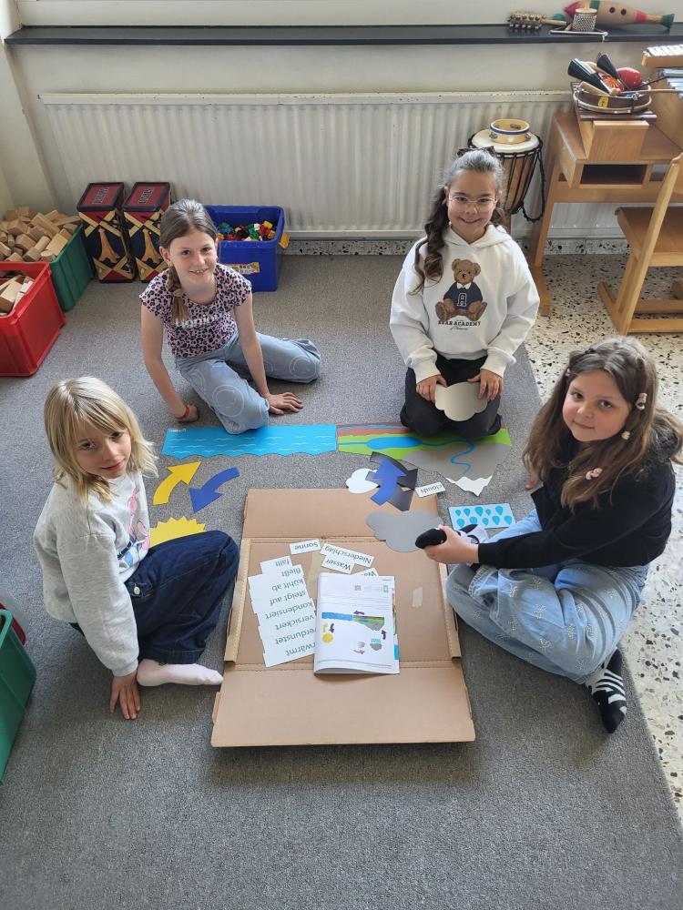 Im Rahmen unseres MINT-Schwerpunktes setzten die Schüler:innen der 3b Klasse das Projekt "Wetter" um. In Gruppen arbeiteten die Kinder mit verschiedenen Materialien wie Thermometer, Windmesser, Kompass und Niederschlagsmesser sowie einem Tafelbild zum Wasserkreislauf. Diese Gegenstände wurden in Kleingruppen untersucht und ausprobiert und anschließend der Klasse vorgestellt.