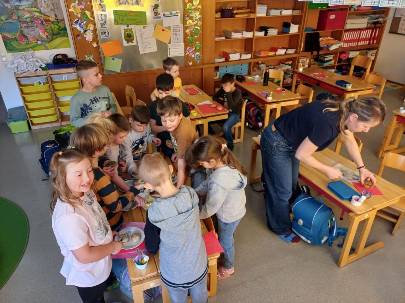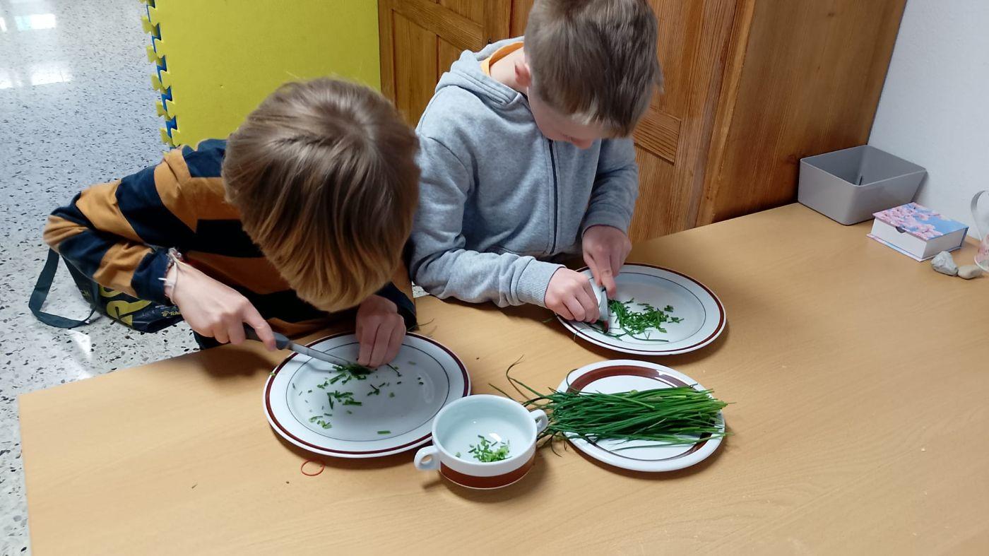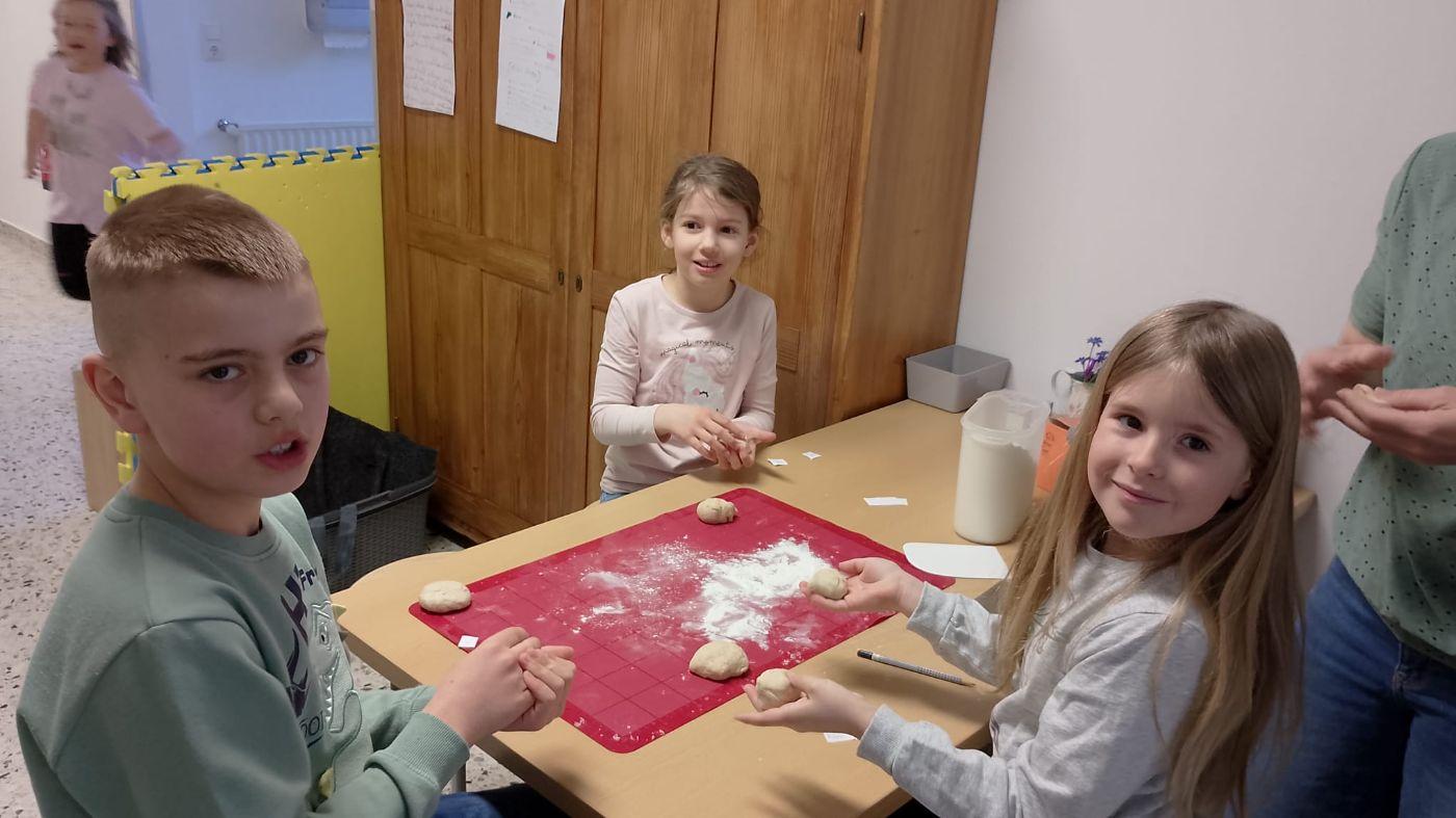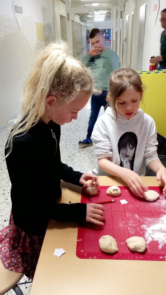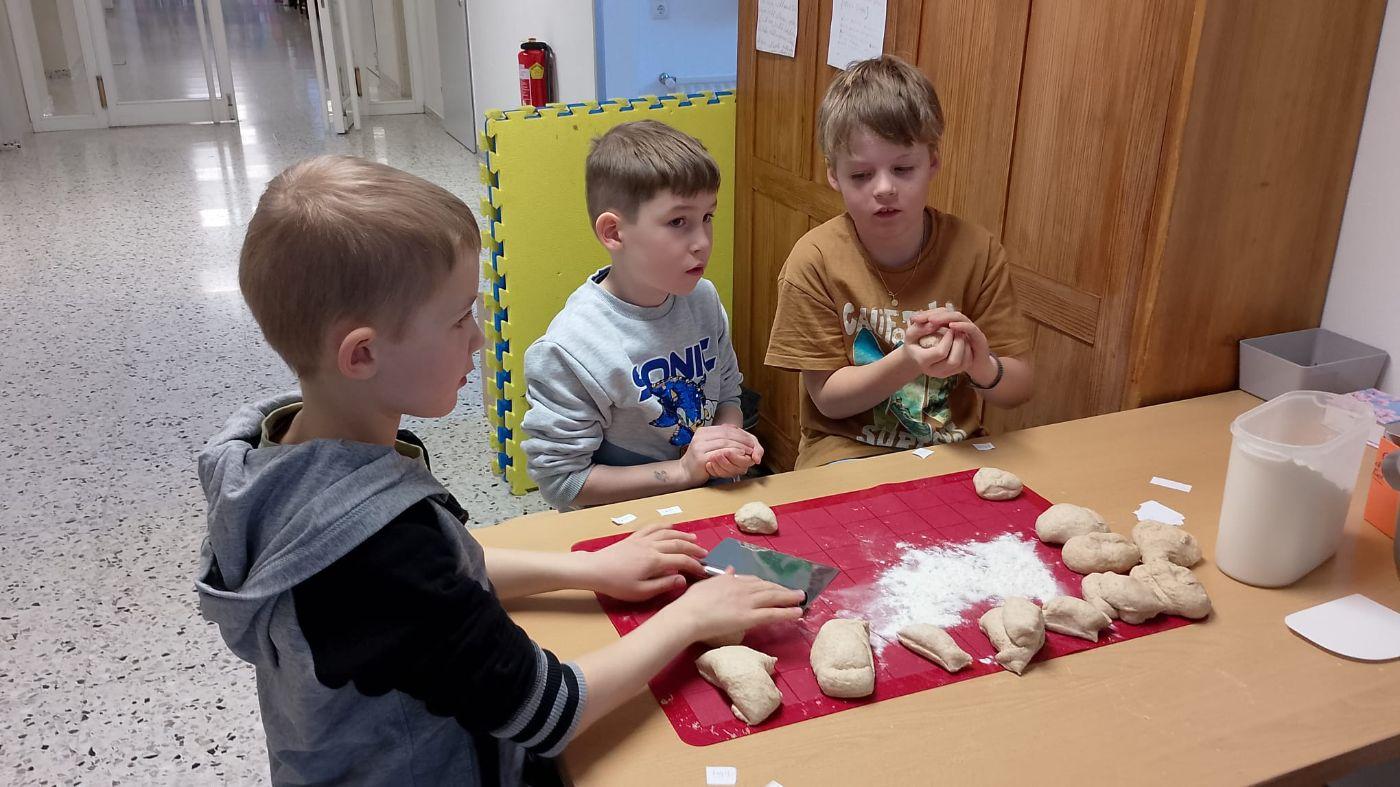 Heute haben wir Brot gebacken. Wir haben Mehl, Wasser, Hefe und Salz abgewogen und in einer Schüssel gemischt. Der Teig war zuerst klebrig, aber nach dem Kneten wurde er weich und glatt. Danach musste der Teig ruhen, damit er größer wird. Zum Schluss haben wir kleine Brötchen geformt und sie im Ofen gebacken. Nach dem Backen haben wir frischen Schnittlauch geschnitten und unsere Semmeln mit Butter und Schnittlauch gegessen. Wer es lieber süß mochte, konnte Marmelade auf die Semmeln streichen und genießen.
