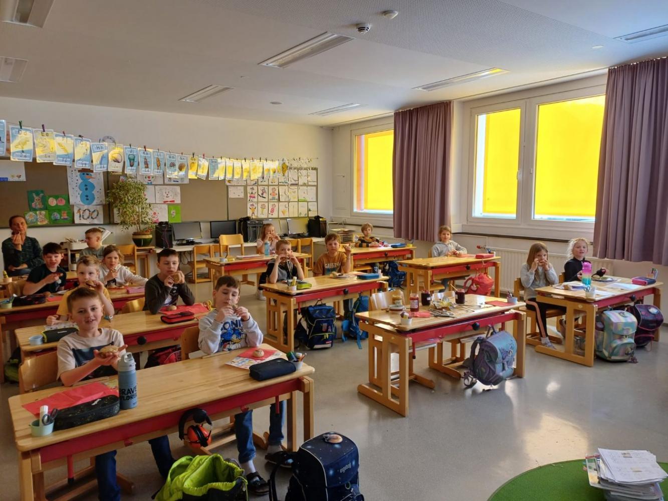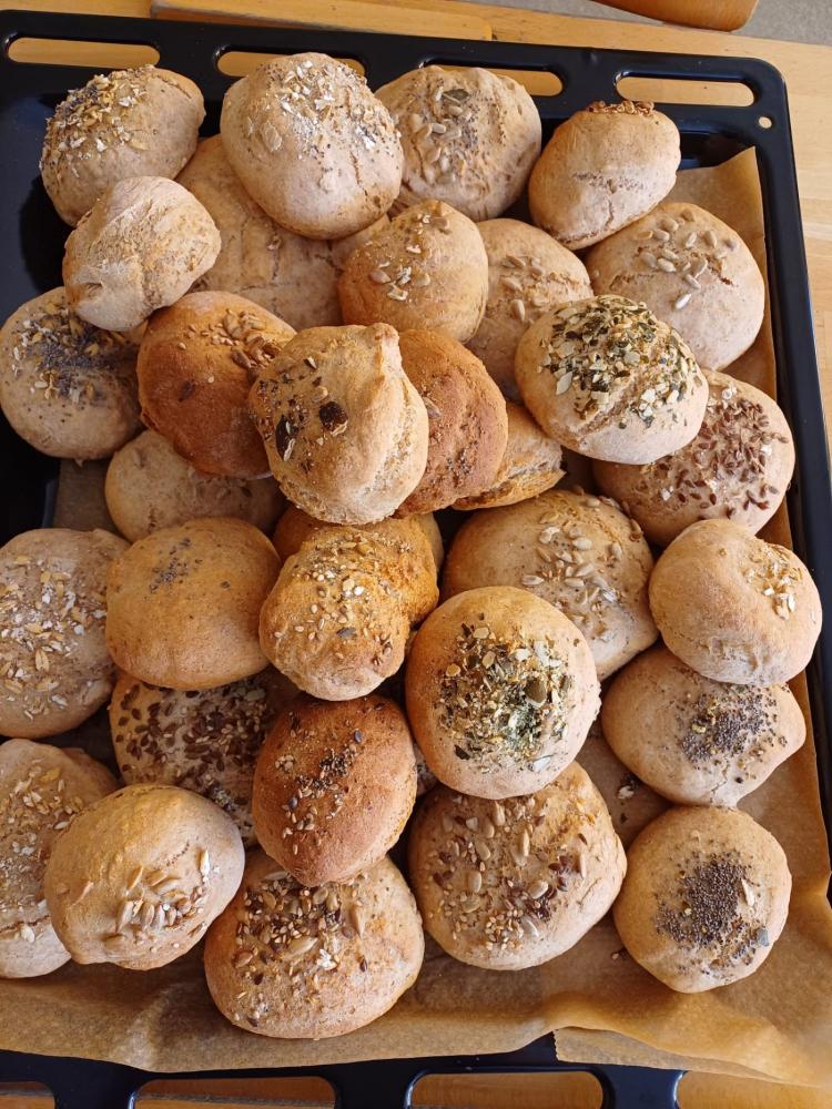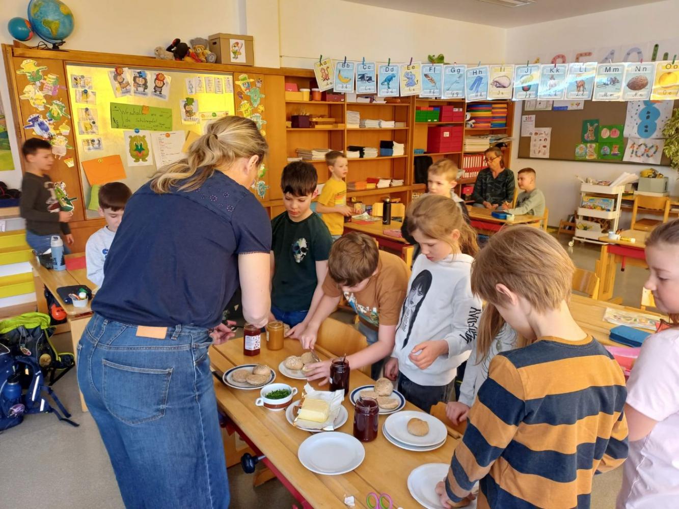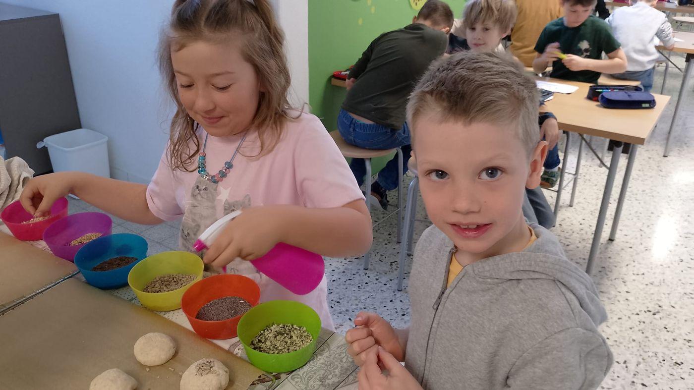 Heute haben wir Brot gebacken. Wir haben Mehl, Wasser, Hefe und Salz abgewogen und in einer Schüssel gemischt. Der Teig war zuerst klebrig, aber nach dem Kneten wurde er weich und glatt. Danach musste der Teig ruhen, damit er größer wird. Zum Schluss haben wir kleine Brötchen geformt und sie im Ofen gebacken. Nach dem Backen haben wir frischen Schnittlauch geschnitten und unsere Semmeln mit Butter und Schnittlauch gegessen. Wer es lieber süß mochte, konnte Marmelade auf die Semmeln streichen und genießen.